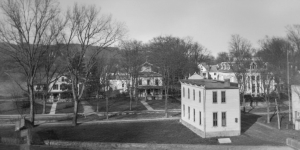 Left-to-right: Ray Durrin’s house in the 1970s, American Legion home on the corner (was A.B.McNish house), the back of the Wash Cnty Post building, Rice Mansion. The roadway to the …