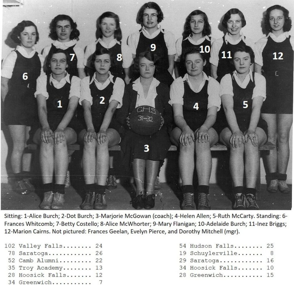 This is the gym where Dot Burch (Benson) scored 72 points in one game … as many points as the boys’ team scored in the entire season! In 1933 CHS girls beat Berlin 81-2. The girls went undefeated for 7 years until the League cancelled the sport because “all the other schools were demoralized trying to compete with Cambridge”.