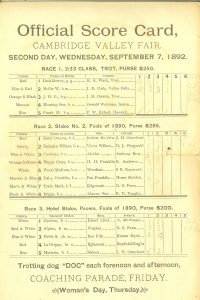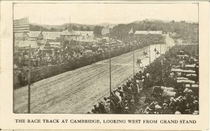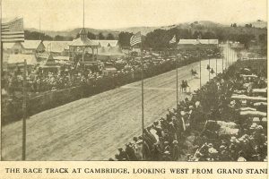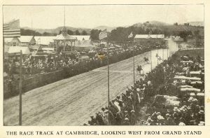 The initial grandstand seated 2,500 and faced north toward the half-mile horse racing track. By 1893 the fair had grown in popularity and the grandstand had to be moved back from the track and increased to 3,300 seats. The fair rented the track to Cambridge High School which held its track meets there.