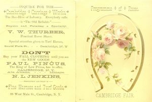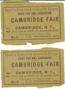 From Whitehall you’d take the D&H to Castleton, VT, down through Granville, and Salem to Cambridge. From Fort Edward you’d take the Fitchburg Line to Mechanicville, east to Eagle Bridge, and north on the D&H to Cambridge. From Greenwich you’d board the G&J to Johnsonville (we old-timers still call County Route 74 the Railroad), then the Fitchburg east to Eagle Bridge, and the D&H north to Cambridge. The $2.70 train ticket included admission to the fair.