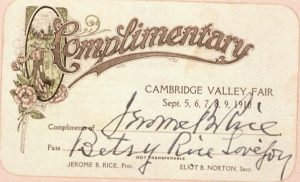 In 1888 Jerome B. Rice helped form the Cambridge Valley Agricultural Society, purchase the Lauderdale Fair, and move it to the north edge of the village. The fairgrounds were located on the east side of North Park Street between Jerome Drive and the railroad tracks. Check Google Earth, the track is still visible.