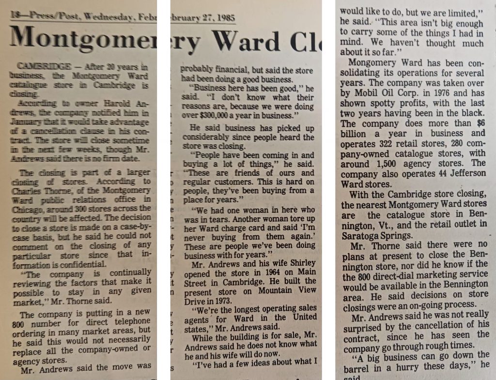 In 1964 the Andrews opened a Montgomery Ward catalog store in the Hitchcock building between Jack Weller’s restaurant and Jimmy Legry’s drug store. In 1973 the store moved to Mountainside Drive, now the White Creek Town Hall across from CCS.