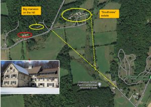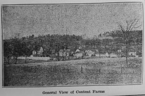 We can see the Content Farm “mansion on the hill” on the west side as you drive along Content Farm Rd. The other portion of the estate, named Southview, is on the other (the east) side of Content Farm Rd, back behind the trees, not really visible from the road. If you go to the top northwest corner of Woodlands Cemetery, poke through the trees, you can get a nice view of Southview if you bring your binoculars.