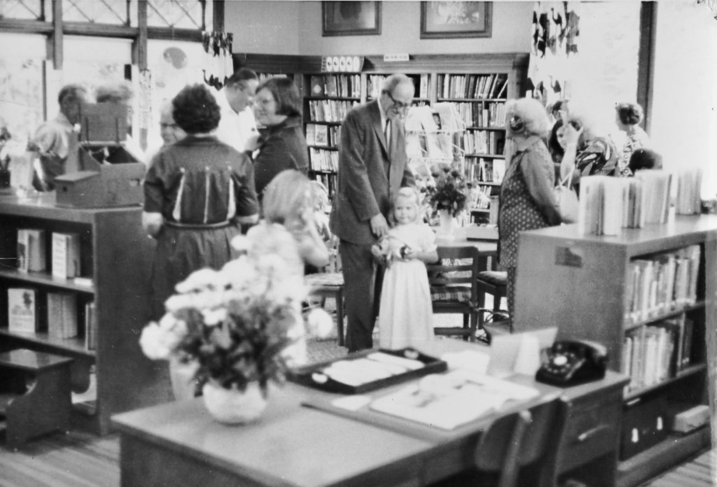 The photo shows where the Library Director’s desk was in 1973. You walked up the slick, slate steps, through the heavy doors, shook off the snow in the vestibule, opened the inner doors, and there sat Katherine, smiling and welcoming you into “her” library.