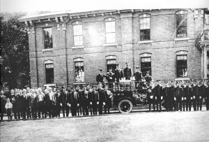 The JB Rice Hose Company No 1 stands with its hose cart in front of the JJ Gray Engine House. The hose cart was pulled by a team of people, not horses. The Russell Hose No 1 disbanded in the early 1890s to be revived two years later under a new name. The new unit was named for Rice, a local business leader and chief engineer of the department.