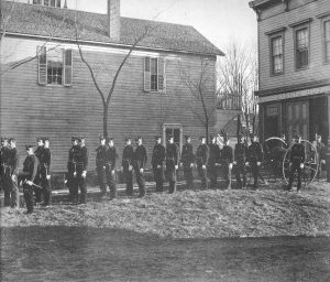Hiram Parrish stands second from the right with the Hallelujah Hose Company No 3. When the fire company was formed in 1887, the name was left blank on the form. The company soon garnered its nickname since many of the local clergy were charter members. In the background on the right is John Crocker’s house that was later torn down by J.B.Rice to build his mansion.