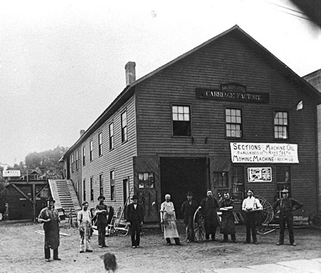 Leading stores were McNish, Carpenter, Copeland, Frisbee, Cramer, Crocker, Eldredge, and Nicholson. There were five blacksmith shops and four carriage manufacturers (see photo). The barbers were Julius Mollier and J.J. Powers. Charles Battle dealt in hides and tallow at the old tannery.