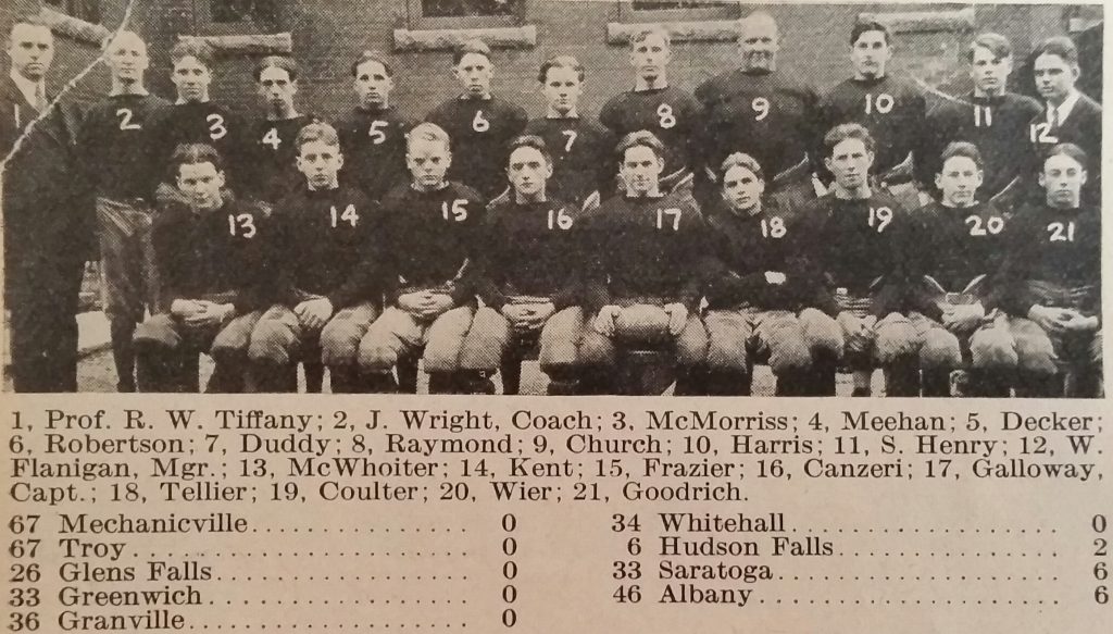 The Cambridge boys had many successful sports teams during this era, none more so than the 1925 football team. Led by Nick Canzeri and John Galloway, Cambridge went 9-0 outscoring their opponents 348-14. For the second year in a row, CHS defeated Albany High School to win the Eastern NY Public High School Athletic League. Martin Church, an 8th grader, stood 6’4” and weighed over 300 pounds, making him no match for the opposing teams’ linemen who rarely weighed more than 140. Later Martin would be well known in these parts as a tuba player in many local bands.