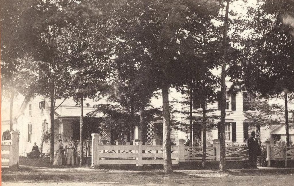 Let’s now take a look at how the barnyard animals on Main Street helped beautify our homes. The Thomas Comstock home (see photo) stood on the south side of East Main Street across from Washington Street. The house was torn down when Grove Street was created in the late 1800s. Notice the fine fence around the house. It was not there as decoration. It was there to keep the cows, pigs, and cattle that roamed Main Street from wandering onto their lawn.