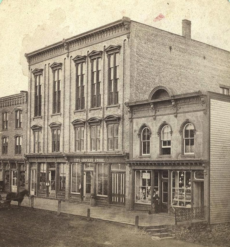 [note: Today the China King restaurant is located on the southwest corner of Main and Union. This brick building was erected after the 1866 fire and has the name Carpenter chiseled into the façade.]