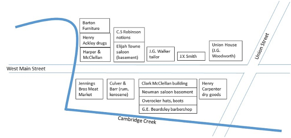 The blaze started in the Jennings Brothers meat market, located on the south side of West Main about where O’Hearn’s is today (see map). This location was long a favorite for meat processing since waste could just be dumped into the Cambridge Creek. One group of firefighters started a bucket brigade on Main Street while another attacked from the other side, trying to raise ladders up the back of the buildings and using water from the creek to drench the roofs.